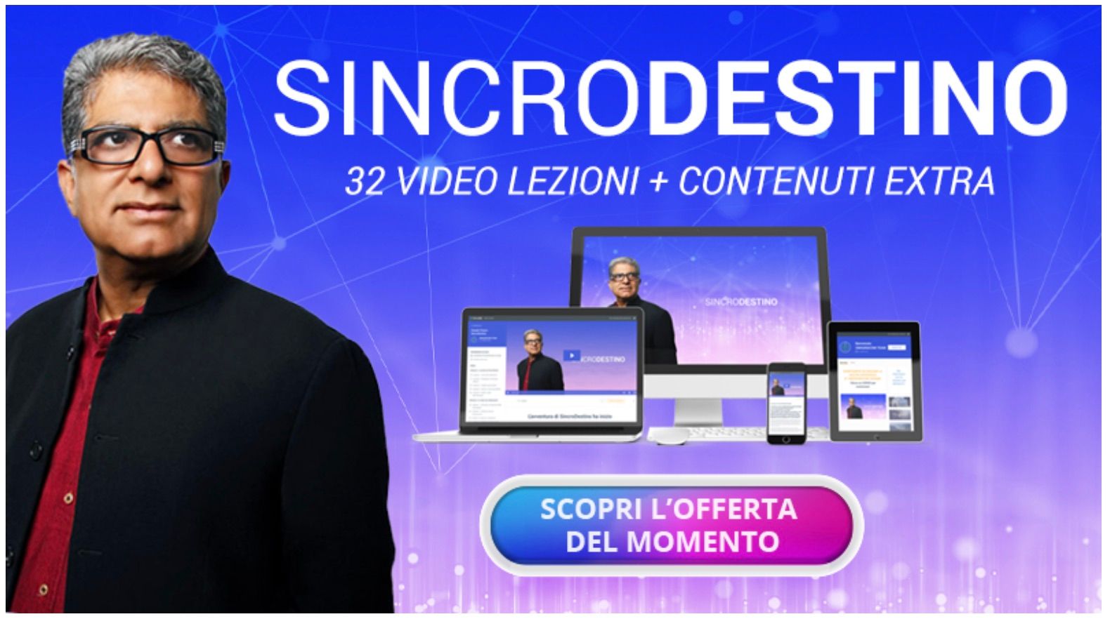 “Sincrodestino” è la prima Masterclass in 5 sessioni di Deepak Chopra disponibile in Italiano. Ti offre accesso illimitato a 32 video lezioni + audio e contenuti in formato pdf per realizzare in modo spontaneo e senza lotte ciò che desideri veramente.